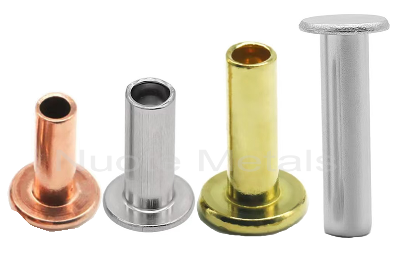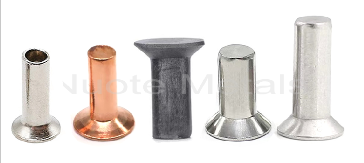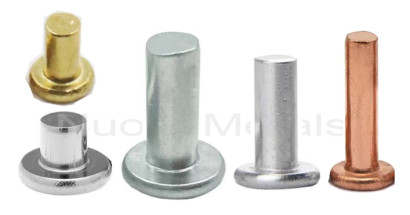 Đinh tán rắn đầu phẳng Trong các vật liệu khác nhau, chẳng hạn như đồng thau, thép (sắt), thép không gỉ, nhôm, đồng.