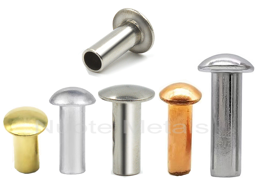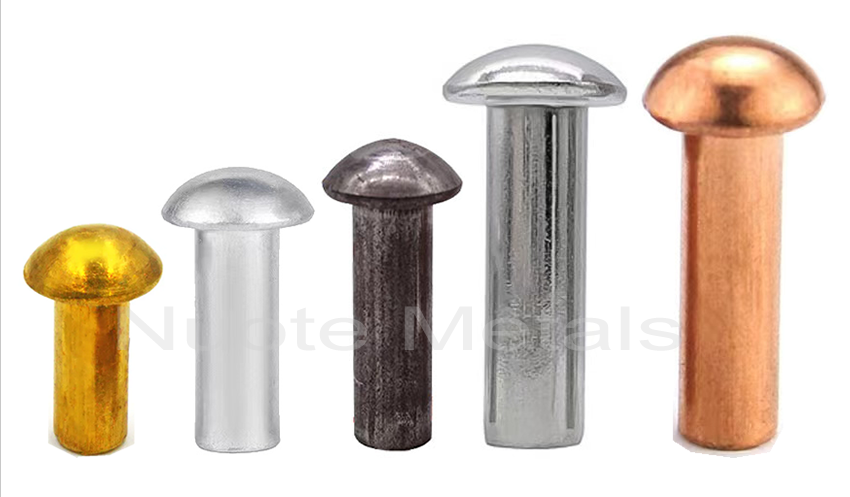 Đinh tán rắn đầu tròn, đinh tán đầu nấm, đinh tán rắn đầu chảo, đinh tán rắn đầu giàn,đinh tán rắn đầu toàn cầu, trong các vật liệu khác nhau, chẳng hạn như đồng thau, thép (sắt), thép không gỉ, nhôm, đồng.
